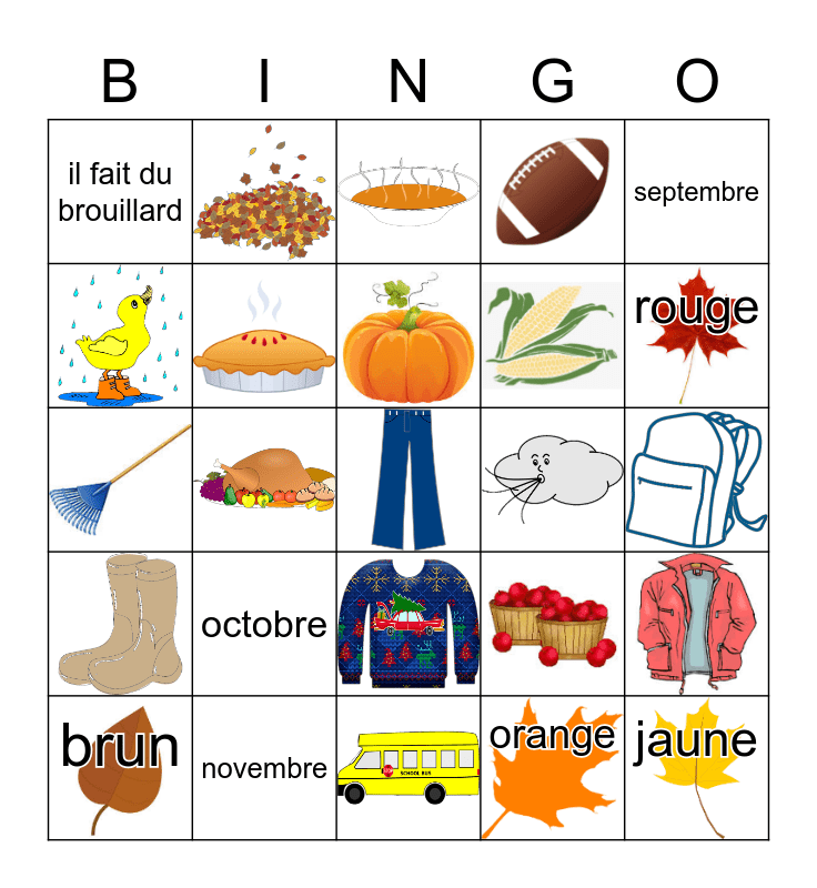 This bingo card has 20 images, a free space and 8 words: octobre, novembre, brun, septembre, il fait du brouillard, orange, rouge and jaune.