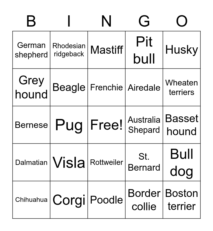 This bingo card has a free space and 29 words: Lab, Corgi, Mastiff, Shabinu, Husky, German shepherd, Beagle, Frenchie, Australia Shepard, Bull dog, Chihuahua, Pug, Border collie, Boston terrier, Bernese, Great Dane, Poodle, St. Bernard, Wheaten terriers, Dalmatian, Visla, Great Pyrenees, Airedale, Basset hound, Grey hound, Rhodesian ridgeback, Rottweiler, Pit bull and Golden retriever.
