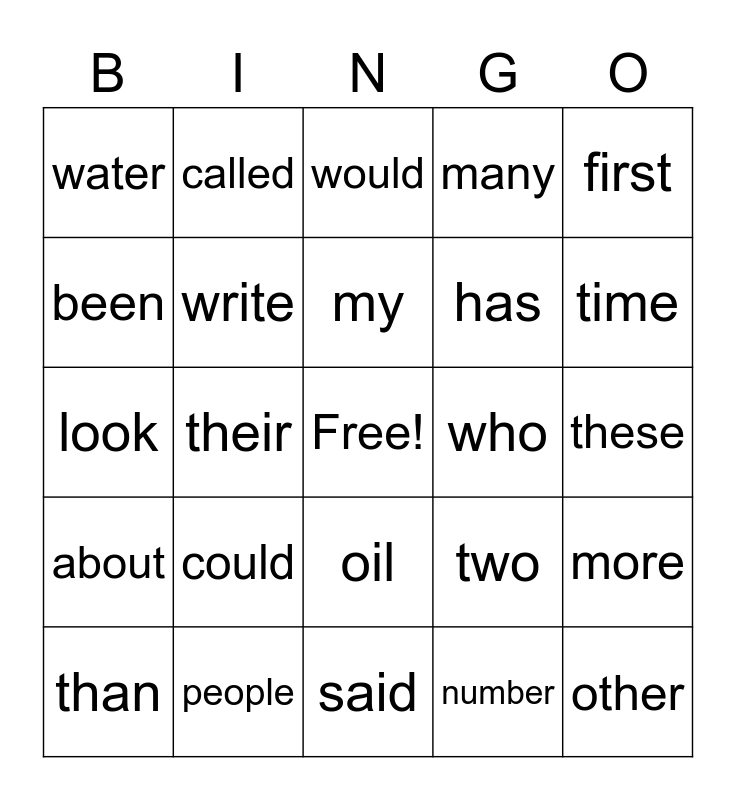 This bingo card has a free space and 24 words: could, people, my, than, first, water, been, called, who, oil, has, look, two, more, write, number, these, would, time, their, other, about, many and said.