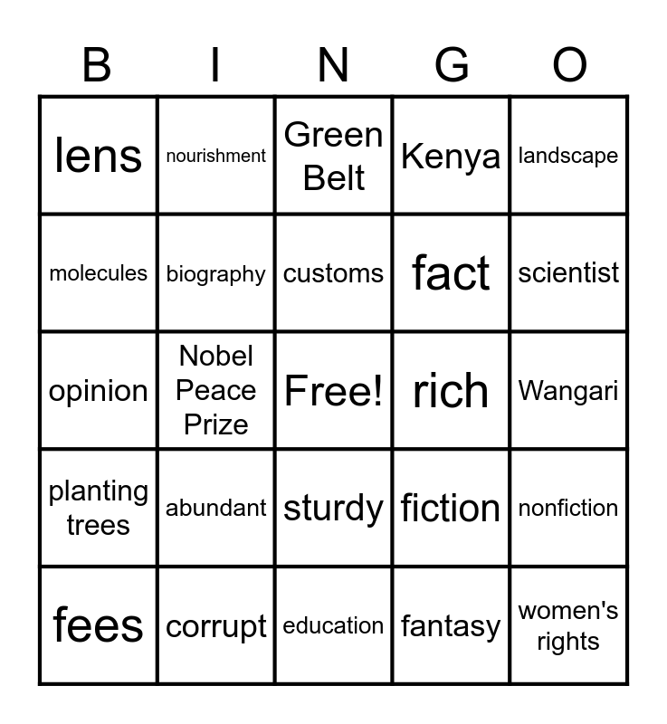 This bingo card has a free space and 24 words: abundant, corrupt, customs, fees, landscape, lens, molecules, nourishment, rich, sturdy, fact, opinion, fiction, nonfiction, biography, fantasy, Wangari, Green Belt, scientist, Nobel Peace Prize, women's rights, planting trees, Kenya and education.