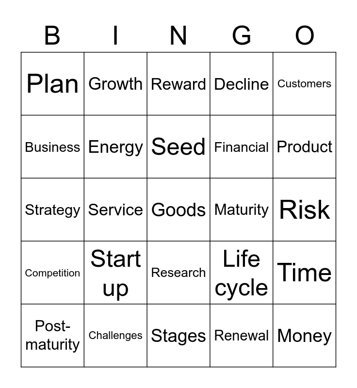 This bingo card has 25 words: Start up, Stages, Seed, Post-maturity, Customers, Plan, Business, Growth, Maturity, Research, Financial, Strategy, Life cycle, Time, Energy, Money, Risk, Reward, Product, Service, Goods, Challenges, Competition, Decline and Renewal.