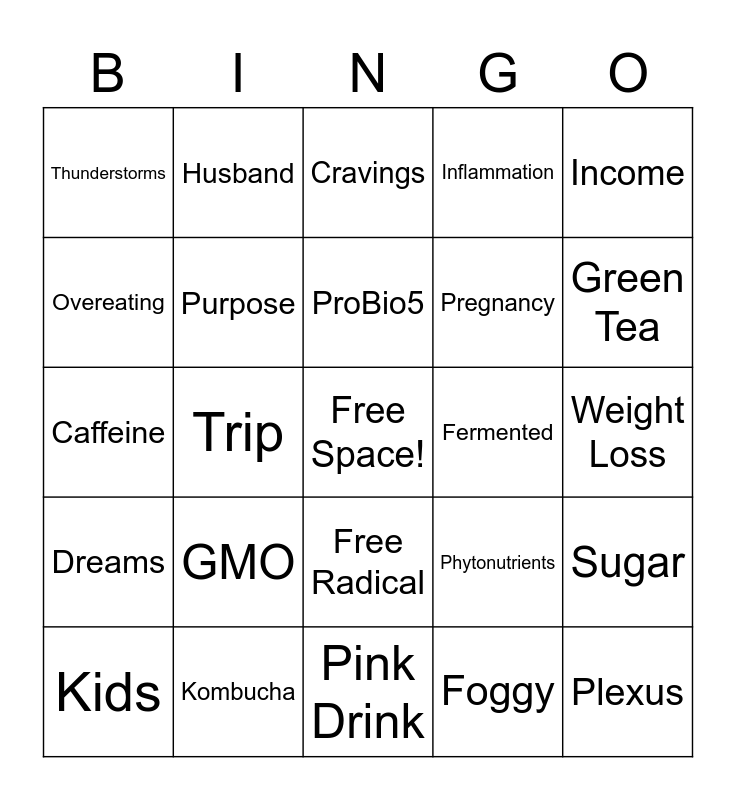 This bingo card has a free space and 34 words: Exhausted, Foggy, Goals, Tools, Dreams, Purpose, Income, Kids, Husband, Nap, ProBio5, Cravings, Think, React, Fermented, Green Tea, Kombucha, Caffeine, GMO, Phytonutrients, Free Radical, Sleep, Thunderstorms, Weight Loss, Pink Drink, Plexus, Inflammation, Nail Bed, Pregnancy, Overeating, Postpartum, Trip, Sugar and Running.