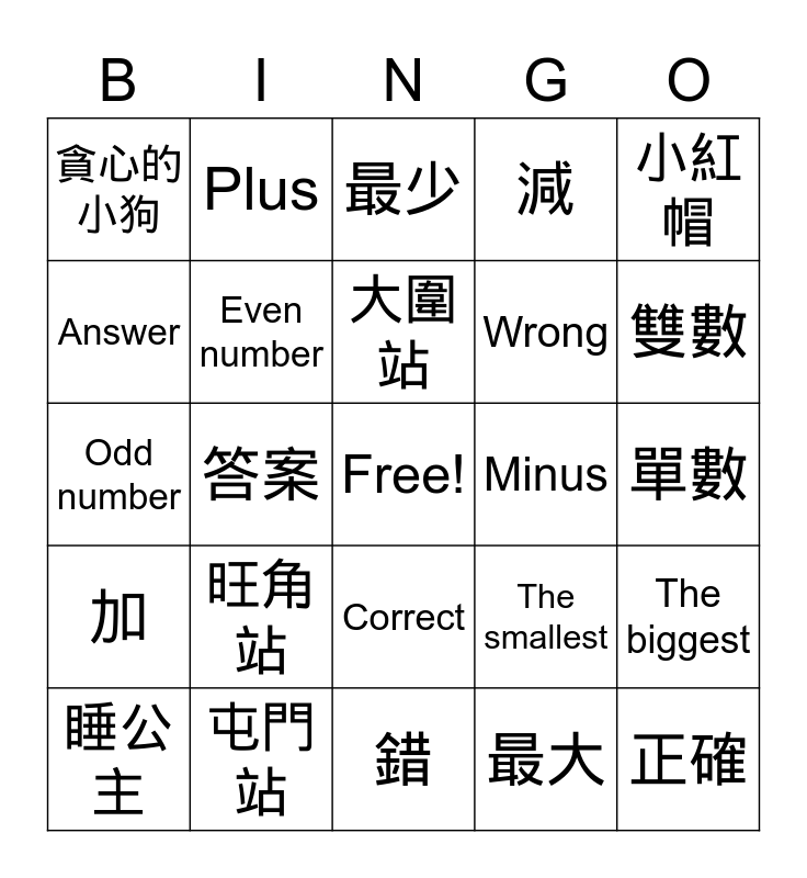 This bingo card has a free space and 24 words: 旺角站, 屯門站, 大圍站, 睡公主, 小紅帽, 貪心的小狗, Answer, Plus, Minus, Correct, Wrong, Odd number, The smallest, The biggest, Even number, 最大, 單數, 最少, 雙數, 答案, 正確, 加, 減 and 錯.