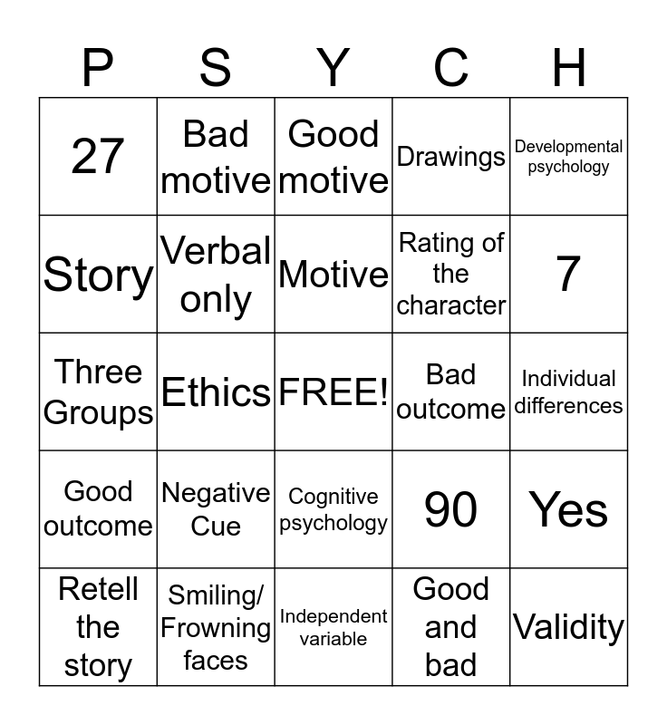 This bingo card has a free space and 27 words: 90, Aim, Rating of the character, Independent variable, Story, Good motive, Bad motive, Good outcome, Bad outcome, Yes, Three Groups, Drawings, Retell the story, Smiling/ Frowning faces, 7, Younger children, Verbal only, Motive, Negative Cue, 27, Individual differences, Good and bad, Ethics, Validity, Cognitive psychology, Developmental psychology and Second Study.