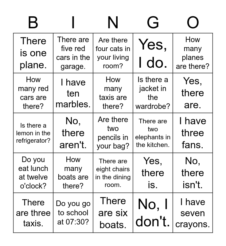 This bingo card has 25 words: How many boats are there?, There are six boats., How many taxis are there?, There are three taxis., How many planes are there?, There is one plane., How many red cars are there?, There are five red cars in the garage., There are two elephants in the kitchen., There are eight chairs in the dining room., Is there a jacket in the wardrobe?, Is there a lemon in the refrigerator?, Yes, there is., No, there isn't., I have ten marbles., I have seven crayons., I have three fans., Are there four cats in your living room?, Yes, there are., No, there aren't., Are there two pencils in your bag?, Do you go to school at 07:30?, Do you eat lunch at twelve o'clock?, Yes, I do. and No, I don't..