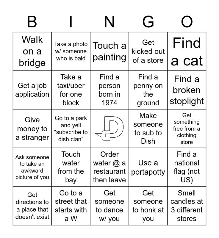 This bingo card has a free space and 24 words: Touch water from the bay, Go to a street that starts with a W, Find a person born in 1974, Get directions to a place that doesn't exist, Find a cat, Walk on a bridge, Get a job application, Take a photo w/ someone who is bald, Make someone to sub to Dish, Order water @ a restaurant then leave, Find a penny on the ground, Give money to a stranger, Use a portapotty, Find a national flag (not US), Take a taxi/uber for one block, Get someone to honk at you, Get something free from a clothing store, Touch a painting, Find a broken stoplight, Go to a park and yell "subscribe to dish clan", Smell candles at 3 different stores, Ask someone to take an awkward picture of you, Get kicked out of a store and Get someone to dance w/ you.
