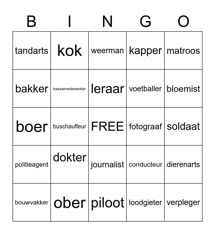 This bingo card has a free space and 39 words: astronaut, brandweerman, danser, conducteur, dierenarts, politieagent, buschauffeur, vlogger, fotograaf, soldaat, bakker, kok, clown, bloemist, boer, dokter, journalist, kapper, kapitein, bouwvakker, kassamedewerker, leraar, loodgieter, matroos, zanger, ober, piloot, postbode, schilder, tandarts, taxi-chauffeur, youtuber, voetballer, verpleger, vuilnisman, vrachtwagen chauffeur, weerman, muzikant and vader.