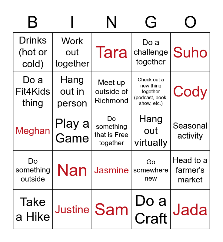 This bingo card has a free space and 29 words: Take a Hike, Mary, Play a Game, Leigh, Drinks (hot or cold), Tara, Hang out in person, Nan, Hang out virtually, Justine, Seasonal activity, Jada, Sam, Do a Craft, Cody, Find out something new about them, Jasmine, Do something outside, Suho, Meghan, Go somewhere new, Katie, Check out a new thing together (podcast, book, show, etc.), Do a Fit4Kids thing, Do a challenge together, Work out together, Head to a farmer's market, Meet up outside of Richmond and Do a mindfulness activity.