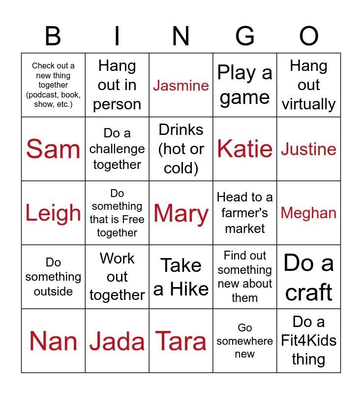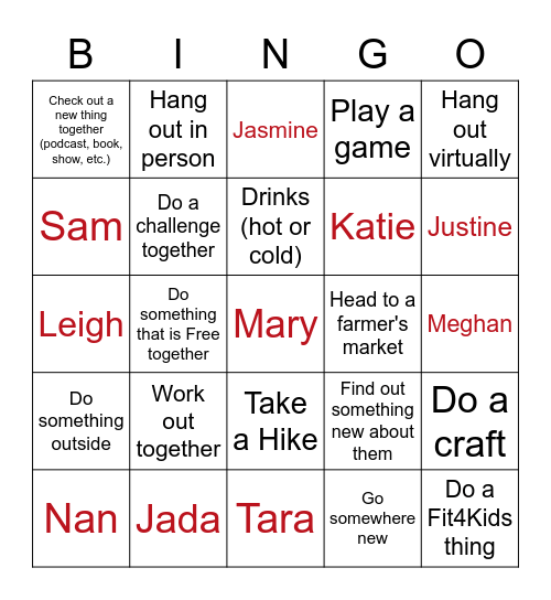 This bingo card has a free space and 29 words: Nan, Do a mindfulness activity, Do something that is Free together, Suho, Check out a new thing together (podcast, book, show, etc.), Jasmine, Do a challenge together, Work out together, Head to a farmer's market, Jada, Meghan, Do a Fit4Kids thing, Tara, Go somewhere new, Justine, Meet up outside of Richmond, Take a Hike, Do something outside, Hang out virtually, Leigh, Find out something new about them, Cody, Katie, Sam, Play a game, Hang out in person, Do a craft, Drinks (hot or cold) and Seasonal activity.