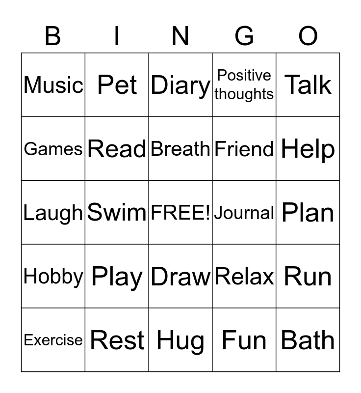 This bingo card has a free space and 24 words: Play, Rest, Breath, Exercise, Talk, Music, Games, Pet, Journal, Draw, Friend, Laugh, Relax, Run, Read, Fun, Plan, Diary, Help, Swim, Bath, Hobby, Positive thoughts and Hug.