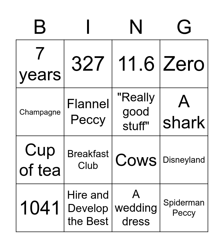 This bingo card has 16 words: Hire and Develop the Best, Disneyland, 11.6, 7 years, Cup of tea, 327, Cows, A wedding dress, Champagne, Flannel Peccy, 1041, Zero, Breakfast Club, A shark, "Really good stuff" and Spiderman Peccy.
