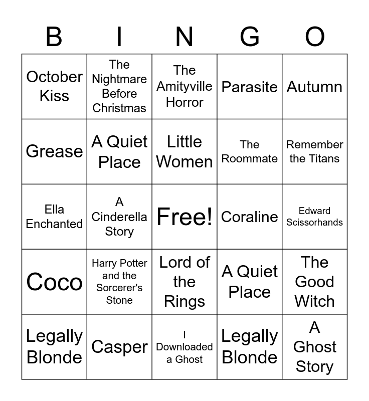 This bingo card has a free space and 85 words: Mean Girls, A Cinderella Story, The Amityville Horror, E.T., I Downloaded a Ghost, Remember the Titans, Ghostbusters, Dead Poets Society, Booksmart, Grease, The Nightmare Before Christmas, Silver Linings Playbook, A Quiet Place, Coraline, A Ghost Story, October Kiss, Legally Blonde, Grease, The Addams Family, Casper, Parasite, The Roommate, A Ghost Story, Little Women, A Cinderella Story, Boo to You Too! Winnie the Pooh, Mickey's House of Villains, Twitches, Twitches Too, Hocus Pocus, Harry Potter and the Sorcerer's Stone, Haloweentown II: Kalabar's Revenge, Haloweentown High, Ella Enchanted, E.T., Corpse Bride, I Downloaded a Ghost, When Harry met Sally, Coco, Remember the Titans, St. Elmo's Fire, Sweet November, Friday Night Lights, October Sky, Matilda, Sleepy Hollow, The Blind Side, Ghostbusters, You've Got Mail, Dead Poets Society, The Nightmare Before Christmas, Little Women, Murder on the Orient Express, Legends of Fall, Good Will Hunting, To All The Boy's Ive Loved Before, Casper, Parasite, The Roommate, Practical Magic, The Addams Family, Booksmart, Grease, Beetlejuice, Teh Craft, Autumn, Clue, The Good Witch, Autumn in New York, October Kiss, Soul Food, Sweet Home Alambama, Silver Linings Playbook, Anne of Green Gables, Dan in Real Life, Lord of the Rings, Legally Blonde, Goosebumps, Close Encounters of the Third Kind, A Ghost Story, Edward Scissorhands, Knives Out, Coraline, A Quiet Place and Jane Eyre.