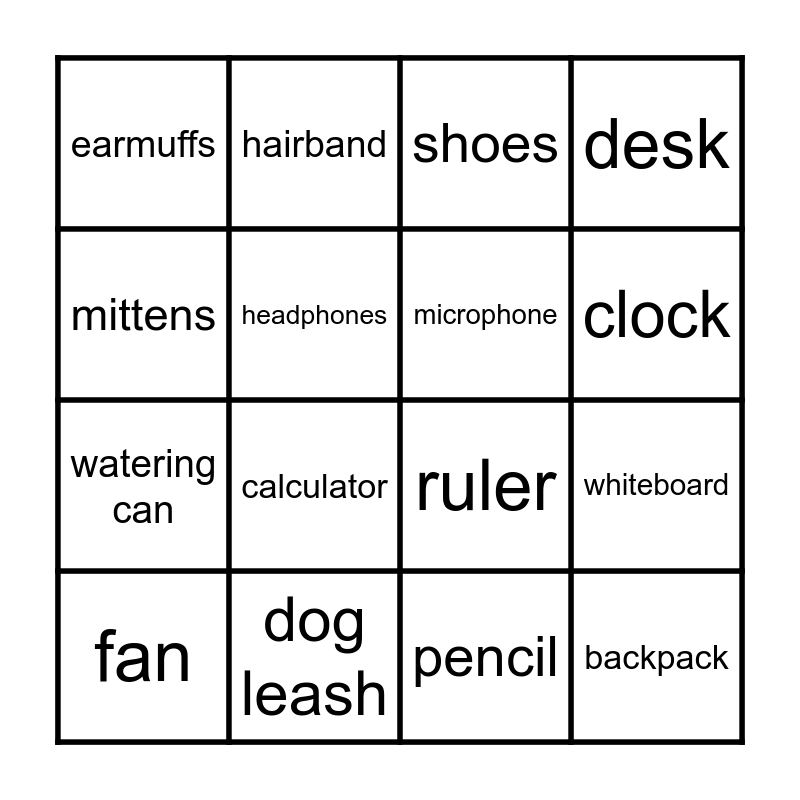 This bingo card has 26 words: Free!, laptop, clock, mask, mittens, earmuffs, headphones, hairband, pencil, pencil sharpener, watering can, ruler, butterfly net, sanitizer, whiteboard, chair, desk, backpack, shoes, fan, calculator, cell phone, dog leash, sweater, microphone and car.