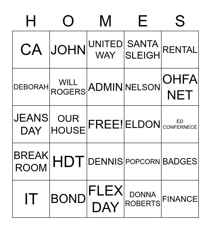 This bingo card has a free space and 24 words: HDT, BOND, ADMIN, IT, RENTAL, CA, DEBORAH, JOHN, ELDON, DENNIS, NELSON, JEANS DAY, POPCORN, BADGES, WILL ROGERS, DONNA ROBERTS, ED CONFERNECE, UNITED WAY, OHFA NET, OUR HOUSE, FINANCE, BREAK ROOM, SANTA SLEIGH and FLEX DAY.