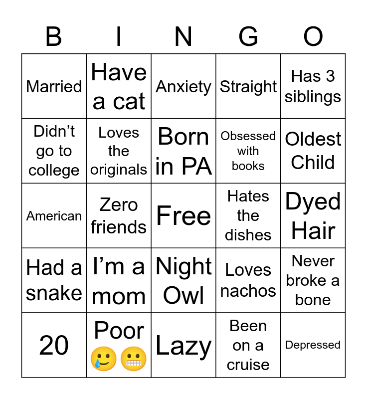 This bingo card has a free space and 24 words: 20, I’m a mom, Born in PA, Been on a cruise, Has 3 siblings, Married, Have a cat, Anxiety, Hates the dishes, Dyed Hair, American, Loves the originals, Loves nachos, Never broke a bone, Didn’t go to college, Poor🥲😬, Lazy, Straight, Oldest Child, Had a snake, Zero friends, Night Owl, Obsessed with books and Depressed.