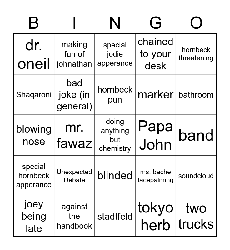 This bingo card has a free space and 24 words: Unexpected Debate, against the handbook, hornbeck pun, joey being late, hornbeck threatening, dr. oneil, Shaqaroni, making fun of johnathan, Papa John, blinded, marker, blowing nose, ms. bache facepalming, soundcloud, bad joke (in general), tokyo herb, band, special jodie apperance, bathroom, mr. fawaz, two trucks, special hornbeck apperance, chained to your desk and stadtfeld.