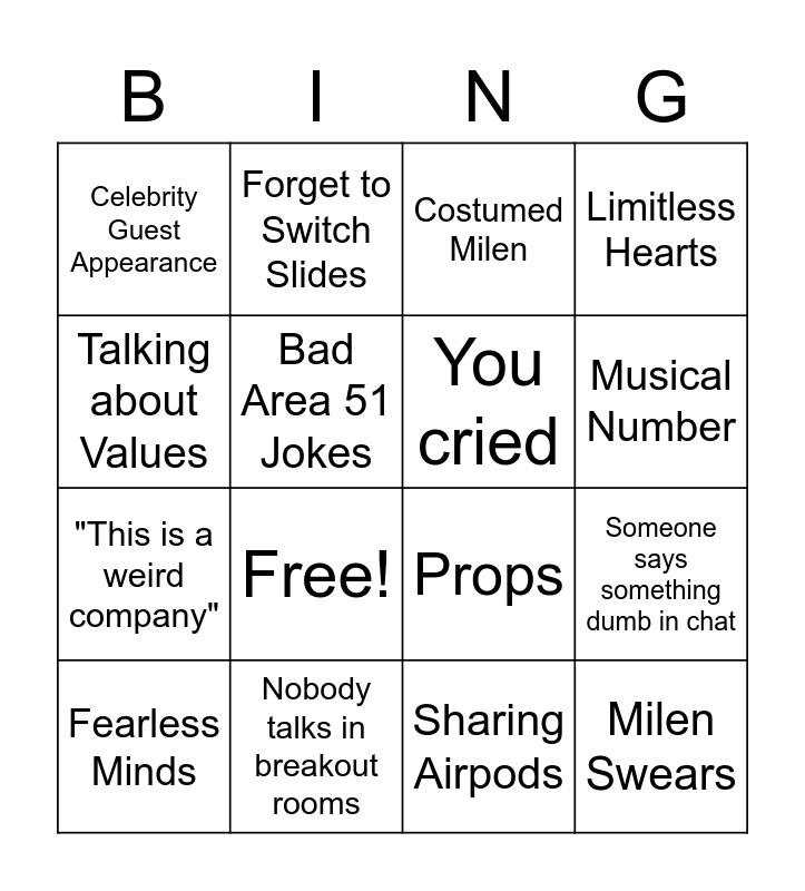 This bingo card has 18 words: Free!, Milen Swears, Costumed Milen, Celebrity Guest Appearance, Props, Limitless Hearts, Fearless Minds, Forget to Switch Slides, Musical Number, "This is a weird company", Sharing Airpods, Talking about Values, Someone says something dumb in chat, Bad Area 51 Jokes, You cried, Audio problems, Nobody talks in breakout rooms and Nobody knows what they're supposed to do.