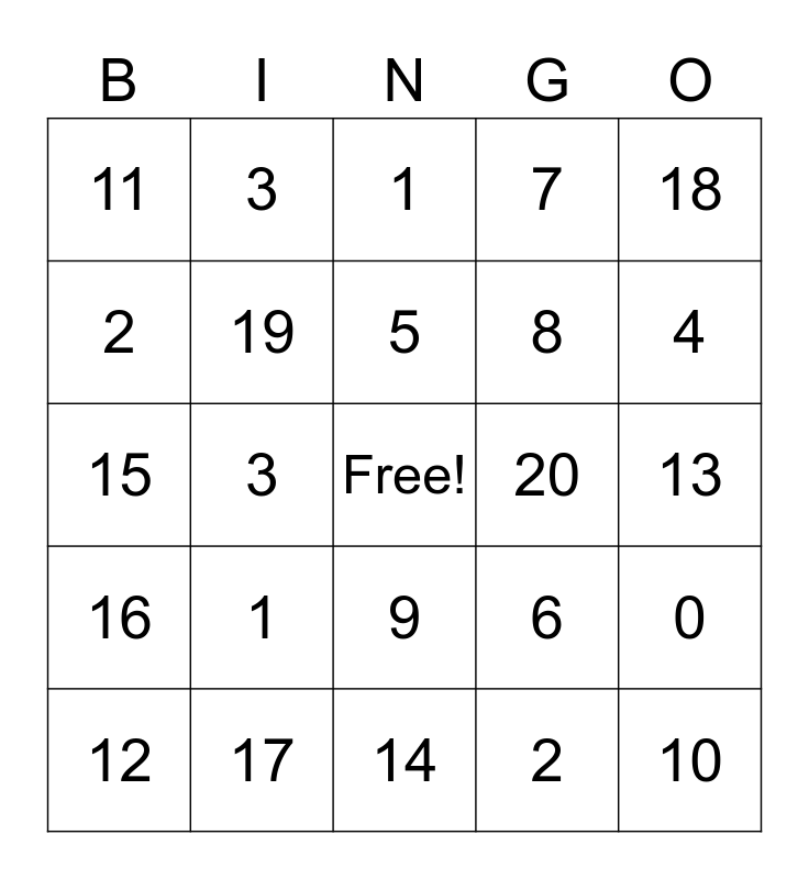 This bingo card has a free space and 24 words: 1, 17, 5, 12, 18, 11, 2, 3, 20, 9, 8, 15, 6, 0, 19, 2, 13, 1, 4, 3, 10, 16, 7 and 14.