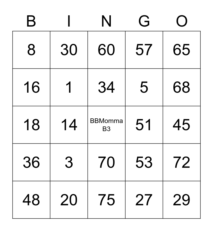 This bingo card has a free space and 24 words: 3, 20, 34, 48, 65, 8, 16, 30, 51, 70, 5, 18, 53, 72, 1, 27, 45, 60, 68, 14, 29, 36, 57 and 75.