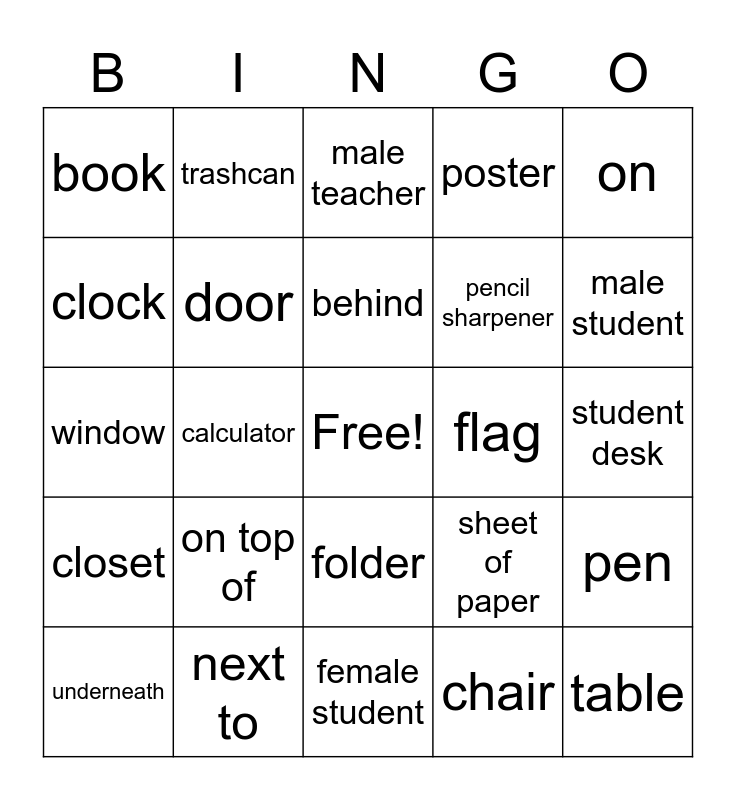 This bingo card has a free space and 24 words: on top of, next to, behind, underneath, on, book, clock, trashcan, flag, folder, pencil sharpener, window, sheet of paper, pen, door, chair, student desk, male teacher, male student, calculator, table, closet, poster and female student.