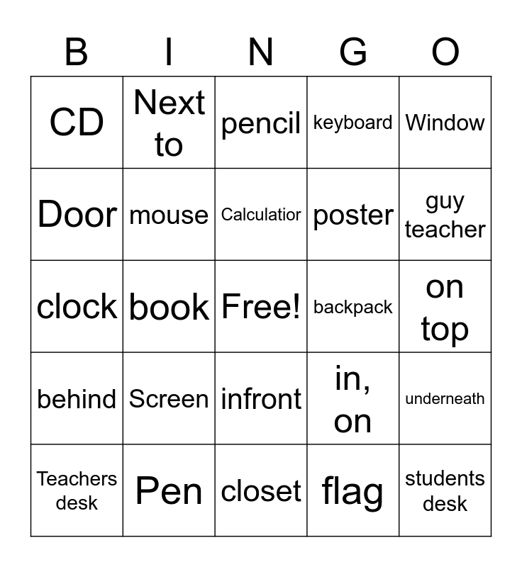 This bingo card has a free space and 24 words: Screen, Pen, Calculatior, Teachers desk, Window, CD, Door, Next to, backpack, infront, poster, clock, in, on, underneath, mouse, flag, on top, pencil, guy teacher, book, students desk, behind, keyboard and closet.