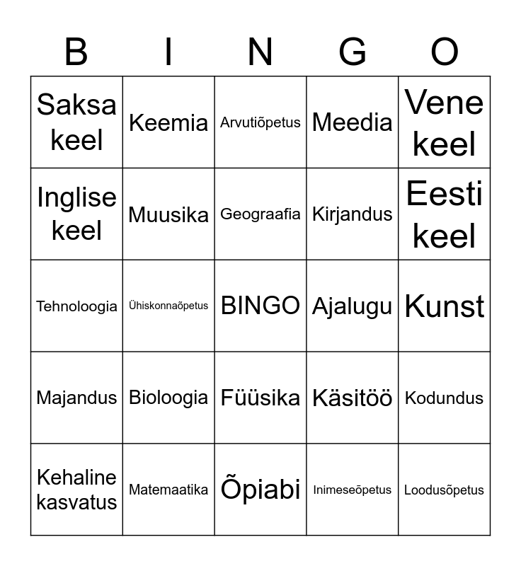 This bingo card has a free space and 24 words: Bioloogia, Matemaatika, Geograafia, Kehaline kasvatus, Vene keel, Saksa keel, Inglise keel, Keemia, Ajalugu, Füüsika, Kirjandus, Tehnoloogia, Käsitöö, Kodundus, Muusika, Inimeseõpetus, Kunst, Arvutiõpetus, Eesti keel, Ühiskonnaõpetus, Loodusõpetus, Majandus, Meedia and Õpiabi.