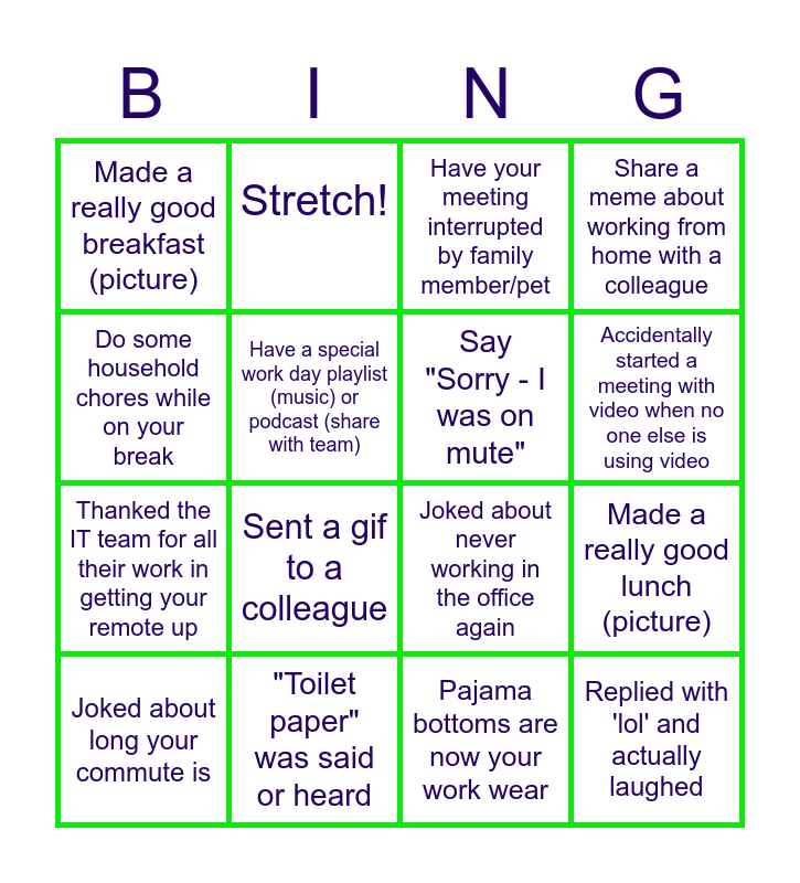 This bingo card has 26 words: Say "Can you hear me?", Did some chair yoga, Joked about never working in the office again, Talked out loud to yourself, Do some household chores while on your break, Stretch!, Say "Sorry - I was on mute", Share a meme about working from home with a colleague, Free!, Sent a gif to a colleague, Pajama bottoms are now your work wear, Accidentally started a meeting with video when no one else is using video, Drank a glass of water!, "Toilet paper" was said or heard, Ask "Can everyone see my screen?", Forgot to brush your teeth this morning, Made a really good breakfast (picture), Have a special work day playlist (music) or podcast (share with team), Have your meeting interrupted by family member/pet, Made a really good lunch (picture), Joked about long your commute is, Chatted with a colleague to see how they are, "Toilet paper" was said or heard, Replied with 'lol' and actually laughed, Thanked the IT team for all their work in getting your remote up and Give a coworker a shout out in huddle.