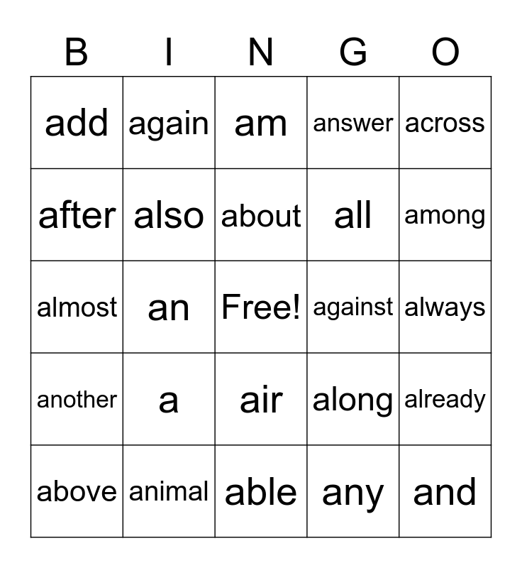 This bingo card has a free space and 25 words: a, able, about, above, across, add, after, again, against, air, all, almost, along, already, also, although, always, am, among, an, and, animal, another, answer and any.