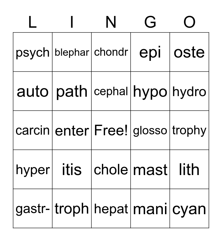 This bingo card has a free space and 24 words: gastr-, itis, cephal, mani, oste, psych, blephar, chondr, glosso, trophy, carcin, path, mast, lith, auto, troph, hepat, epi, hydro, hyper, enter, chole, hypo and cyan.