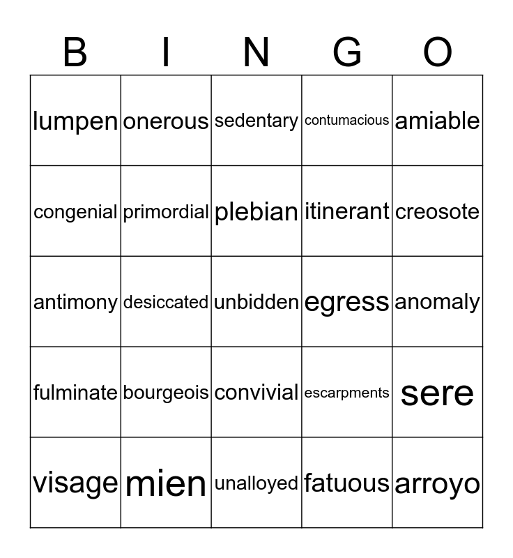 This bingo card has a free space and 24 words: bourgeois, mien, plebian, visage, amiable, lumpen, congenial, onerous, egress, convivial, itinerant, antimony, escarpments, sere, primordial, fatuous, anomaly, sedentary, creosote, desiccated, arroyo, fulminate, contumacious and unalloyed.