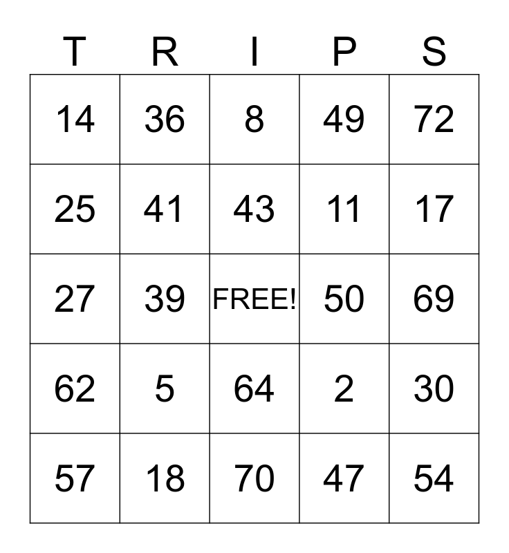 This bingo card has a free space and 24 words: 5, 18, 43, 57, 72, 14, 25, 36, 50, 64, 11, 27, 2, 30, 41, 47, 69, 8, 17, 39, 54, 62, 49 and 70.