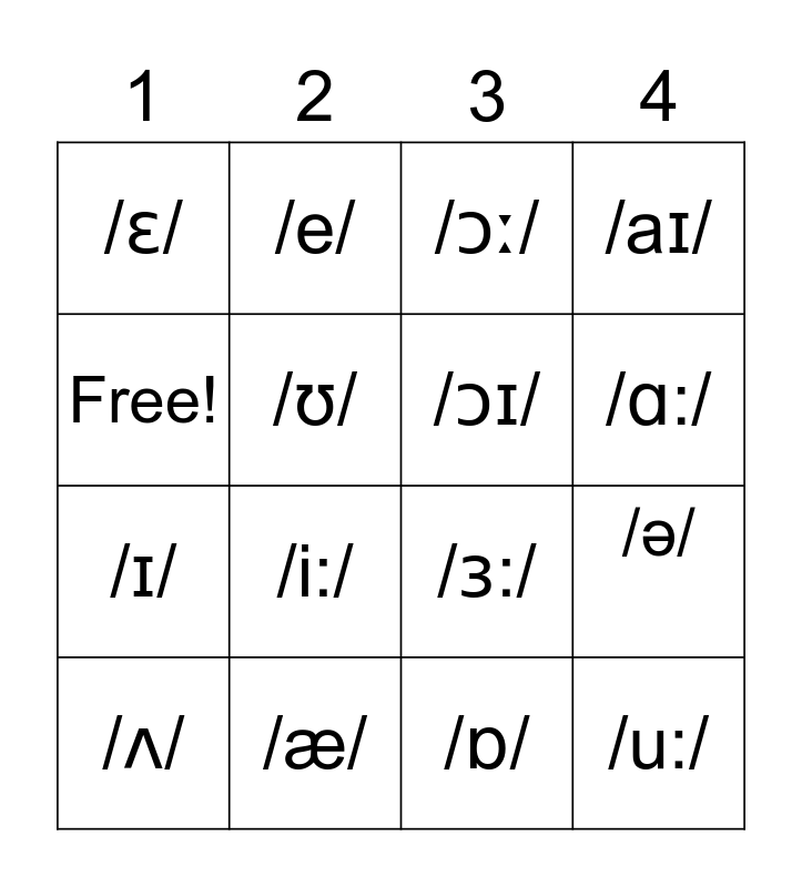 This bingo card has 16 words: /æ/, /ə/, /ɔː/, /ɛ/, /ɪ/, /e/, /ɜ:/, /ɒ/, Free!, /ʊ/, /ʌ/, /aɪ/, /i:/, /ɑ:/, /ɔɪ/ and /u:/.