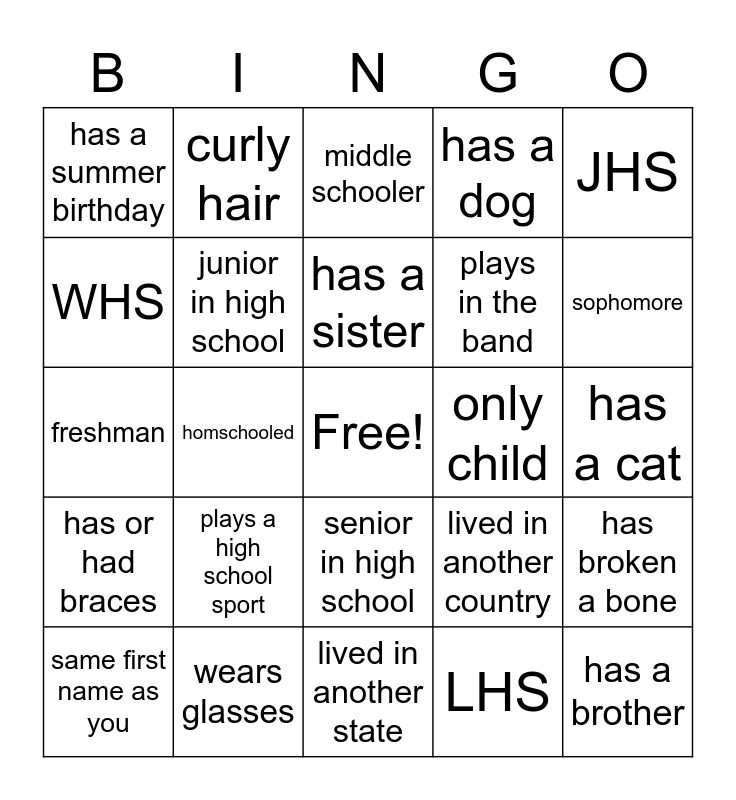 This bingo card has a free space and 24 words: plays a high school sport, wears glasses, has a sister, same first name as you, JHS, has a summer birthday, WHS, curly hair, only child, senior in high school, plays in the band, freshman, lived in another country, has broken a bone, junior in high school, LHS, has a cat, middle schooler, sophomore, homschooled, has a brother, has or had braces, has a dog and lived in another state.