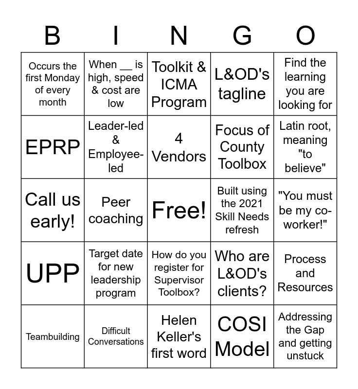 This bingo card has a free space and 24 words: Target date for new leadership program, Difficult Conversations, 4 Vendors, Teambuilding, Find the learning you are looking for, Occurs the first Monday of every month, EPRP, When __ is high, speed & cost are low, Built using the 2021 Skill Needs refresh, How do you register for Supervisor Toolbox?, Focus of County Toolbox, Call us early!, Who are L&OD's clients?, Process and Resources, Leader-led & Employee-led, COSI Model, "You must be my co-worker!", Toolkit & ICMA Program, Latin root, meaning "to believe", Peer coaching, Addressing the Gap and getting unstuck, UPP, L&OD's tagline and Helen Keller's first word.