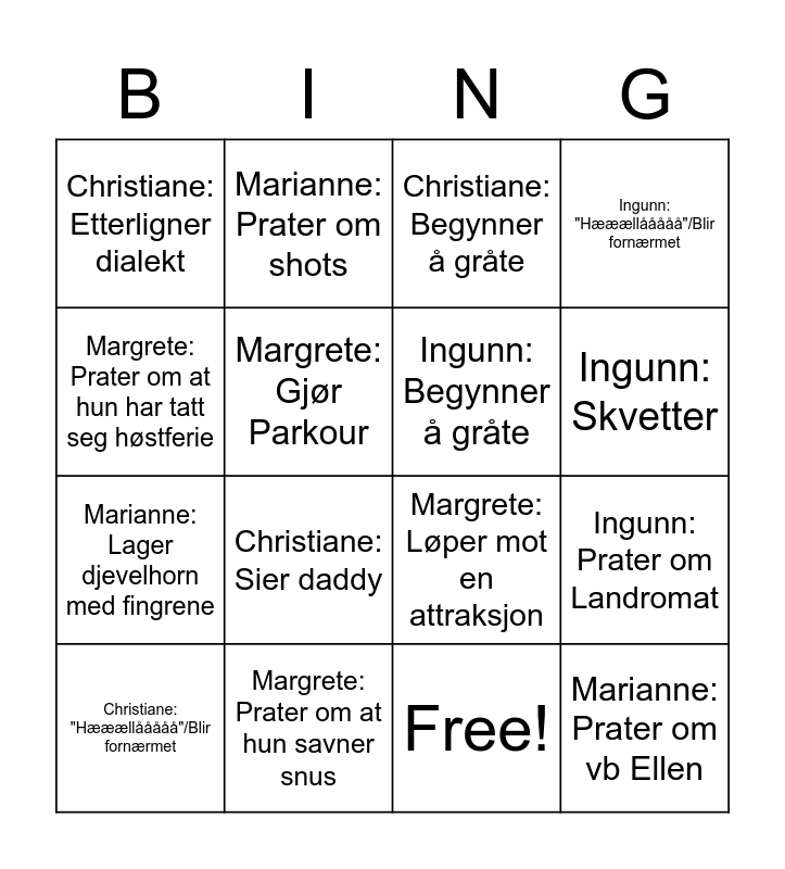 This bingo card has 17 words: Free!, Christiane: "Hææællååååå"/Blir fornærmet, Christiane: Begynner å gråte, Christiane: Etterligner dialekt, Christiane: Sier daddy, Ingunn: "Hææællååååå"/Blir fornærmet, Ingunn: Prater om Landromat, Ingunn: Begynner å gråte, Ingunn: Skvetter, Margrete: Gjør Parkour, Margrete: Prater om at hun savner snus, Margrete: Løper mot en attraksjon, Margrete: Prater om at hun har tatt seg høstferie, Marianne: Prater om shots, Marianne: Lager djevelhorn med fingrene, Marianne: Prater om at hun er redd for å bli sulten and Marianne: Prater om vb Ellen.