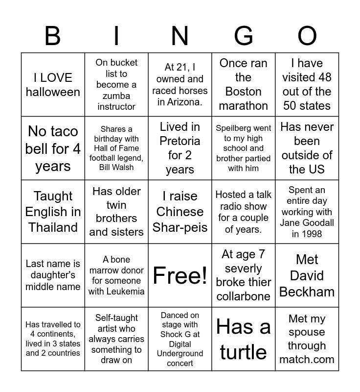 This bingo card has 26 words: Free!, Has a turtle, Lived in Pretoria for 2 years, Self-taught artist who always carries something to draw on, I have visited 48 out of the 50 states, I LOVE halloween, No taco bell for 4 years, On bucket list to become a zumba instructor, Spent an entire day working with Jane Goodall in 1998, At age 7 severly broke thier collarbone, Speilberg went to my high school and brother partied with him, Taught English in Thailand, Met David Beckham, Has travelled to 4 continents, lived in 3 states and 2 countries, Has older twin brothers and sisters, First car was a Pinto station wagon, Once ran the Boston marathon, Last name is daughter's middle name, At 21, I owned and raced horses in Arizona., I raise Chinese Shar-peis, Has never been outside of the US, Danced on stage with Shock G at Digital Underground concert, Hosted a talk radio show for a couple of years., A bone marrow donor for someone with Leukemia, Shares a birthday with Hall of Fame football legend, Bill Walsh and Met my spouse through match.com.