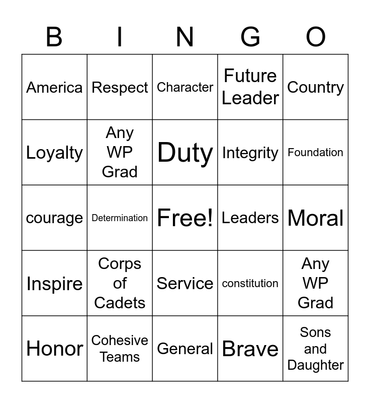 This bingo card has a free space and 24 words: Corps of Cadets, Cohesive Teams, Duty, Honor, Country, America, Loyalty, Respect, Leaders, Service, Integrity, courage, constitution, Any WP Grad, Any WP Grad, Brave, Moral, Character, Foundation, Determination, Sons and Daughter, Inspire, Future Leader and General.