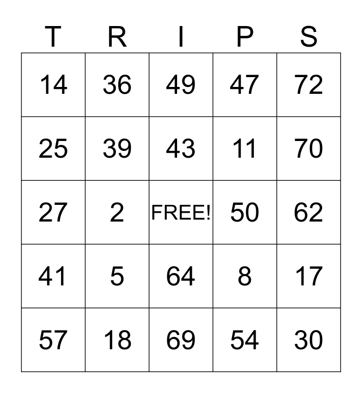 This bingo card has a free space and 24 words: 5, 18, 43, 57, 72, 14, 25, 36, 50, 64, 11, 27, 8, 17, 39, 54, 62, 49, 70, 2, 30, 41, 47 and 69.