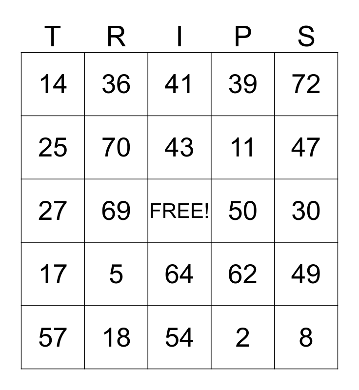 This bingo card has a free space and 24 words: 5, 18, 43, 57, 72, 14, 25, 36, 50, 64, 11, 27, 62, 49, 70, 2, 30, 41, 47, 69, 8, 17, 39 and 54.