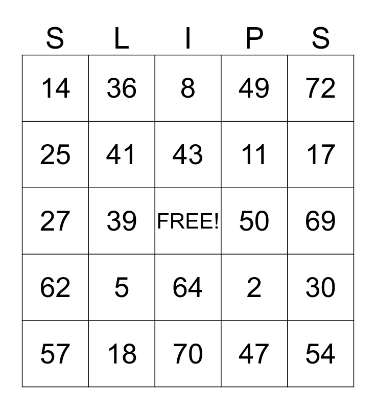 This bingo card has a free space and 24 words: 5, 18, 43, 57, 72, 14, 25, 36, 50, 64, 11, 27, 2, 30, 41, 47, 69, 8, 17, 39, 54, 62, 49 and 70.