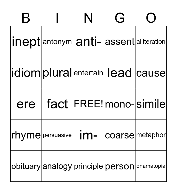 This bingo card has a free space and 24 words: persuasive, analogy, entertain, obituary, alliteration, inept, idiom, antonym, mono-, im-, lead, ere, coarse, metaphor, plural, person, simile, anti-, cause, fact, onamatopia, rhyme, assent and principle.