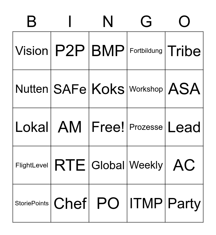 This bingo card has a free space and 24 words: RTE, Chef, Koks, StoriePoints, Tribe, Vision, Nutten, P2P, Prozesse, Global, Workshop, Lokal, Weekly, AC, SAFe, ITMP, Lead, BMP, ASA, AM, Party, FlightLevel, Fortbildung and PO.