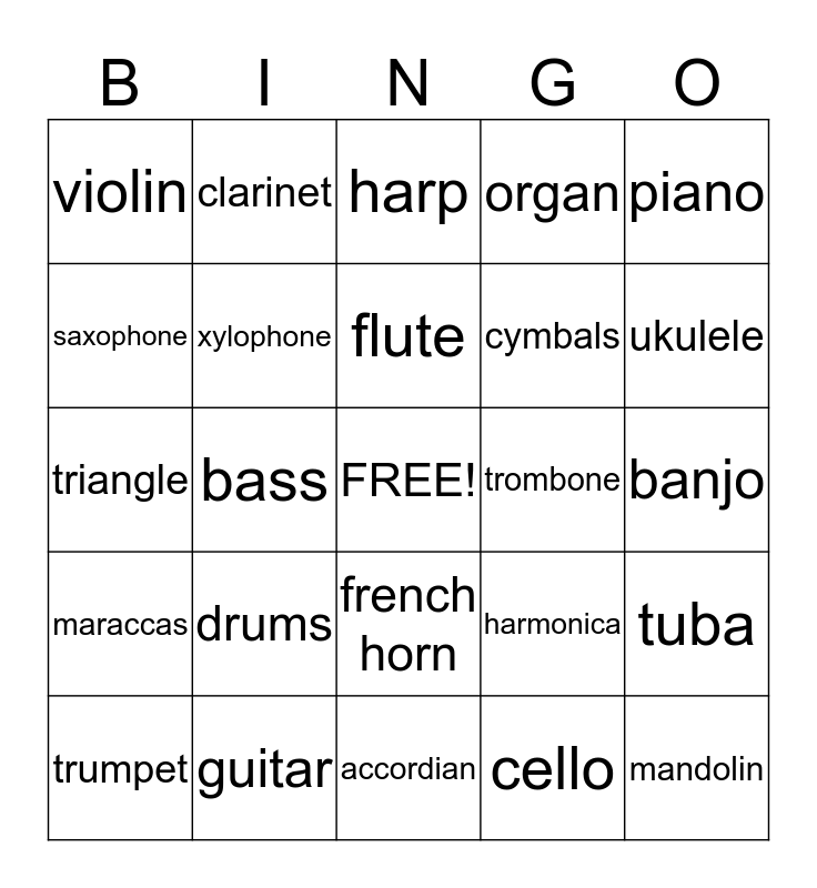 This bingo card has a free space and 24 words: drums, guitar, flute, trumpet, piano, violin, saxophone, clarinet, trombone, french horn, cymbals, triangle, harmonica, tuba, xylophone, cello, banjo, harp, ukulele, bass, mandolin, maraccas, organ and accordian.