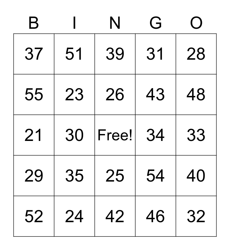This bingo card has a free space and 41 words: 20, 21, 22, 23, 24, 25, 26, 27, 28, 29, 30, 31, 32, 33, 34, 35, 36, 37, 38, 39, 40, 41, 42, 43, 44, 45, 46, 47, 48, 49, 50, 51, 52, 53, 54, 55, 56, 57, 58, 59 and 60.
