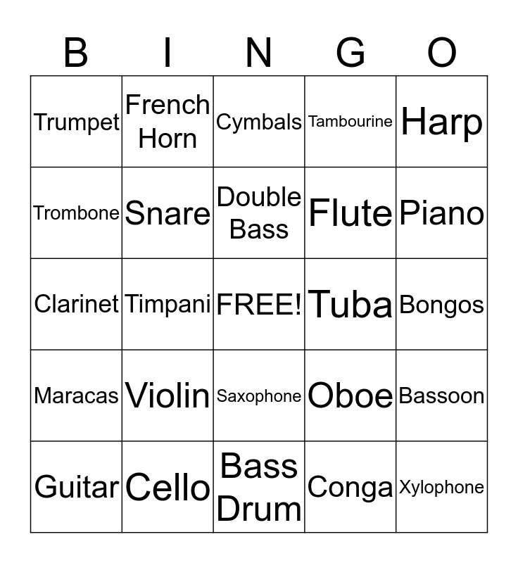 This bingo card has a free space and 24 words: Violin, Cello, Double Bass, Guitar, Harp, Trumpet, Trombone, French Horn, Tuba, Saxophone, Flute, Clarinet, Oboe, Bassoon, Snare, Conga, Bongos, Cymbals, Piano, Timpani, Xylophone, Maracas, Tambourine and Bass Drum.