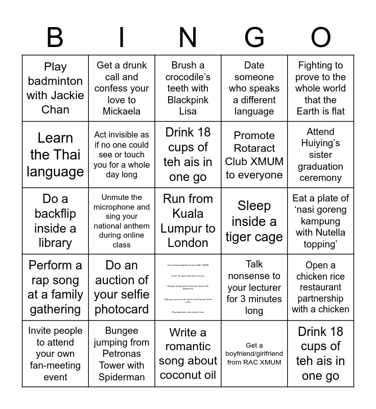 This bingo card has 26 words: Get a boyfriend/girlfriend from RAC XMUM Drink 18 cups of teh ais in one go Bungee jumping from Petronas Tower with Spiderman Fighting to prove to the whole world that the Earth is flat Play badminton with Jackie Chan, Get a boyfriend/girlfriend from RAC XMUM, Drink 18 cups of teh ais in one go, Bungee jumping from Petronas Tower with Spiderman, Fighting to prove to the whole world that the Earth is flat, Play badminton with Jackie Chan, Learn the Thai language, Get a drunk call and confess your love to Mickaela, Eat a plate of ‘nasi goreng kampung with Nutella topping’, Talk nonsense to your lecturer for 3 minutes long, Promote Rotaract Club XMUM to everyone, Do a backflip inside a library, Open a chicken rice restaurant partnership with a chicken, Invite people to attend your own fan-meeting event, Unmute the microphone and sing your national anthem during online class, Share a plate of roti tisu with Mr. Prime Minister, Date someone who speaks a different language, Perform a rap song at a family gathering, Brush a crocodile’s teeth with Blackpink Lisa, Run from Kuala Lumpur to London, Attend Huiying’s sister graduation ceremony, Write a romantic song about coconut oil, Sleep inside a tiger cage, Do an auction of your selfie photocard, Act invisible as if no one could see or touch you for a whole day long and Drink 18 cups of teh ais in one go.