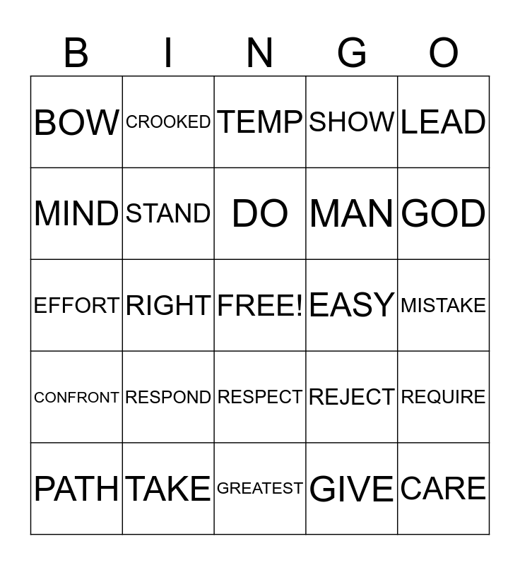This bingo card has a free space and 24 words: RESPOND, TAKE, DO, PATH, LEAD, BOW, MIND, CROOKED, EASY, RESPECT, MAN, EFFORT, REJECT, REQUIRE, STAND, GIVE, MISTAKE, TEMP, GOD, RIGHT, CARE, CONFRONT, SHOW and GREATEST.