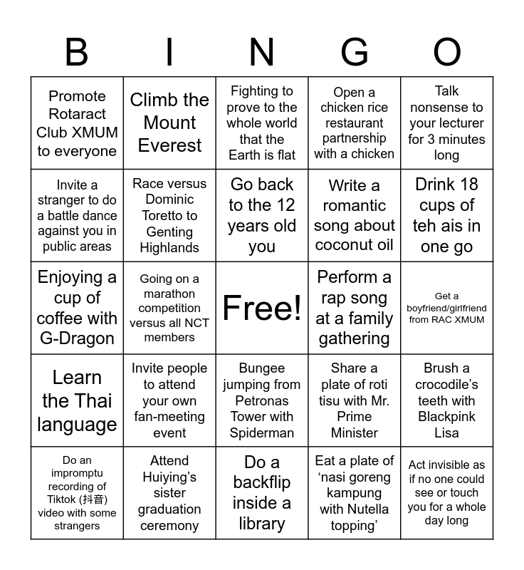 This bingo card has a free space and 25 words: Invite people to attend your own fan-meeting event, Do a backflip inside a library, Go back to the 12 years old you, Do an impromptu recording of Tiktok (抖音) video with some strangers, Talk nonsense to your lecturer for 3 minutes long, Promote Rotaract Club XMUM to everyone, Invite a stranger to do a battle dance against you in public areas, Climb the Mount Everest, Perform a rap song at a family gathering, Bungee jumping from Petronas Tower with Spiderman, Write a romantic song about coconut oil, Enjoying a cup of coffee with G-Dragon, Share a plate of roti tisu with Mr. Prime Minister, Brush a crocodile’s teeth with Blackpink Lisa, Race versus Dominic Toretto to Genting Highlands, Run from Kuala Lumpur to London, Get a boyfriend/girlfriend from RAC XMUM, Fighting to prove to the whole world that the Earth is flat, Drink 18 cups of teh ais in one go, Going on a marathon competition versus all NCT members, Act invisible as if no one could see or touch you for a whole day long, Attend Huiying’s sister graduation ceremony, Learn the Thai language, Open a chicken rice restaurant partnership with a chicken and Eat a plate of ‘nasi goreng kampung with Nutella topping’.