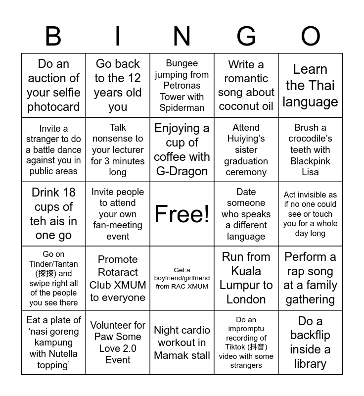 This bingo card has a free space and 25 words: Promote Rotaract Club XMUM to everyone, Night cardio workout in Mamak stall, Enjoying a cup of coffee with G-Dragon, Eat a plate of ‘nasi goreng kampung with Nutella topping’, Learn the Thai language, Do an auction of your selfie photocard, Invite a stranger to do a battle dance against you in public areas, Go back to the 12 years old you, Date someone who speaks a different language, Get a boyfriend/girlfriend from RAC XMUM, Attend Huiying’s sister graduation ceremony, Drink 18 cups of teh ais in one go, Run from Kuala Lumpur to London, Perform a rap song at a family gathering, Talk nonsense to your lecturer for 3 minutes long, Open a chicken rice restaurant partnership with a chicken, Act invisible as if no one could see or touch you for a whole day long, Bungee jumping from Petronas Tower with Spiderman, Brush a crocodile’s teeth with Blackpink Lisa, Invite people to attend your own fan-meeting event, Do a backflip inside a library, Volunteer for Paw Some Love 2.0 Event, Go on Tinder/Tantan (探探) and swipe right all of the people you see there, Write a romantic song about coconut oil and Do an impromptu recording of Tiktok (抖音) video with some strangers.