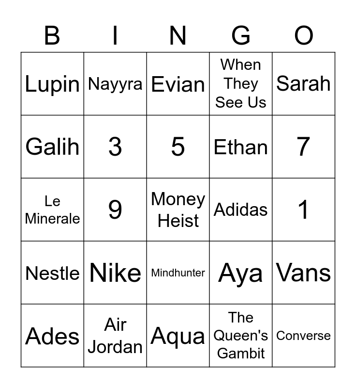 This bingo card has a free space and 24 words: Ades, Nike, 5, The Queen's Gambit, Sarah, Lupin, Nayyra, Evian, Adidas, 1, Le Minerale, 3, Aya, Vans, Galih, Air Jordan, Aqua, When They See Us, 7, Nestle, 9, Mindhunter, Ethan and Converse.